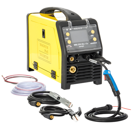 Spawarka MAGNUM MIG 220 LCD Alu/Cu, uchwyt MIG MB15 3m, uchwyt MMA, przewód masowy, instrukcja obsługi.